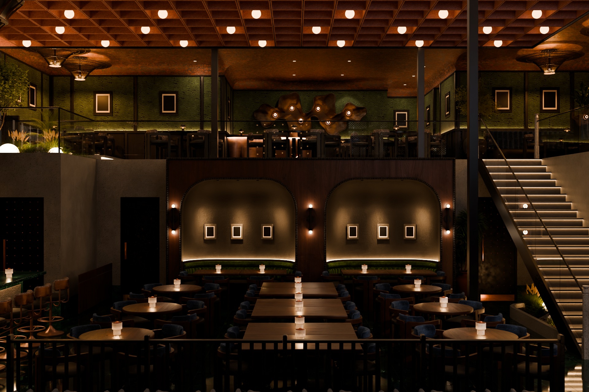 This new space in the U.S. reimagines that essence with a contemporary, high-end soul. The dark, moody interiors lit by lanterns that echo Indian streetscapes, sculptural wooden arches reminiscent of temple architecture, and acoustic walls—each element carrying the legacy forward. Here, textures speak louder than colors. Intricately carved panels absorb sound like secrets whispered through centuries, while 3D glass blocks—rooted in tradition yet resonating with global modernism—filter both light and music with equal grace.